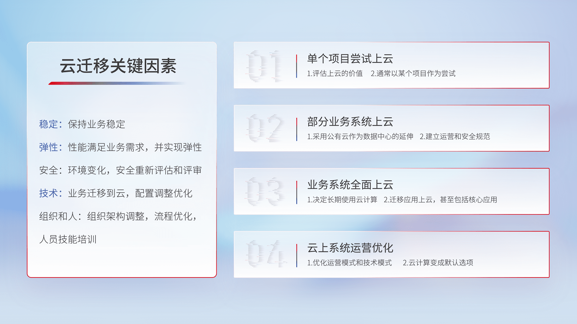 结合实际业务,,,,从规划设计、、、、云平台选型、、、云原生改造、、数据迁移、、集成交付,,,,迁移全过程为客户识别最佳上云路径,,做好风险识别管理,,,,设计网络架构、、、身份权限、、、、安全审计合规、、、、操作审计、、、、日志审计、、监控告警策略、、多站点容灾设计等,,对云上基础设施进行整体规划,,,提升IT治理水平,,以满足弹性、、高可用、、、、高性能的需求。。