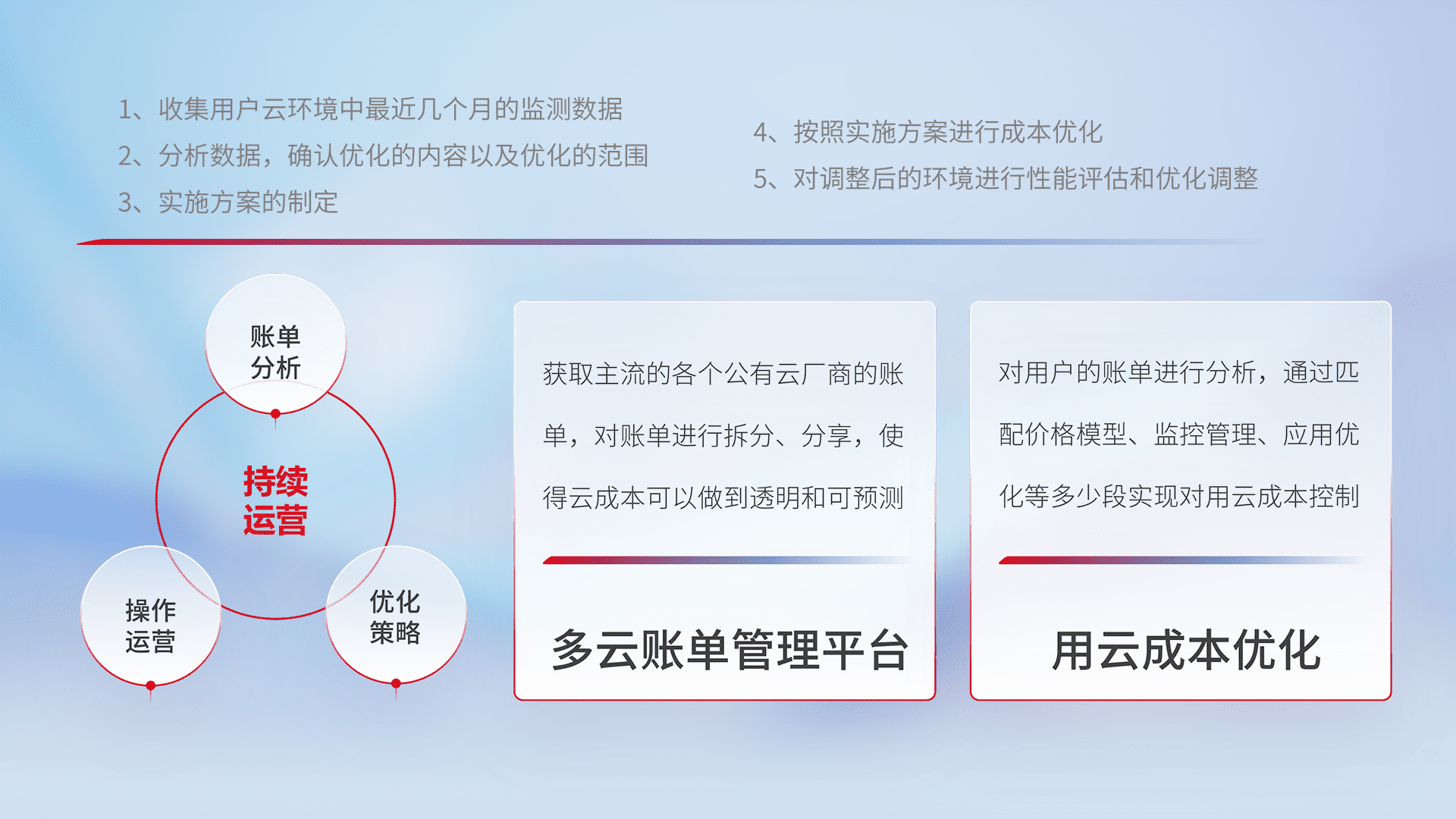 通过多云纳管,,,以统一的资源数据模型把客户的云资源进行抽象和封装,,,进而实现对多云资源的统一操作,,保障云资源管理的可靠性、、、稳定性与可用性。。。。量身定制化运维内容,,,,配置、、开发运维、、、补丁管理、、、、备份、、、、监控、、、、认证和访问管理、、、审计和日常巡检等,,保障在用云过程中的可靠度,,,,稳定度以及高可用率。。。
