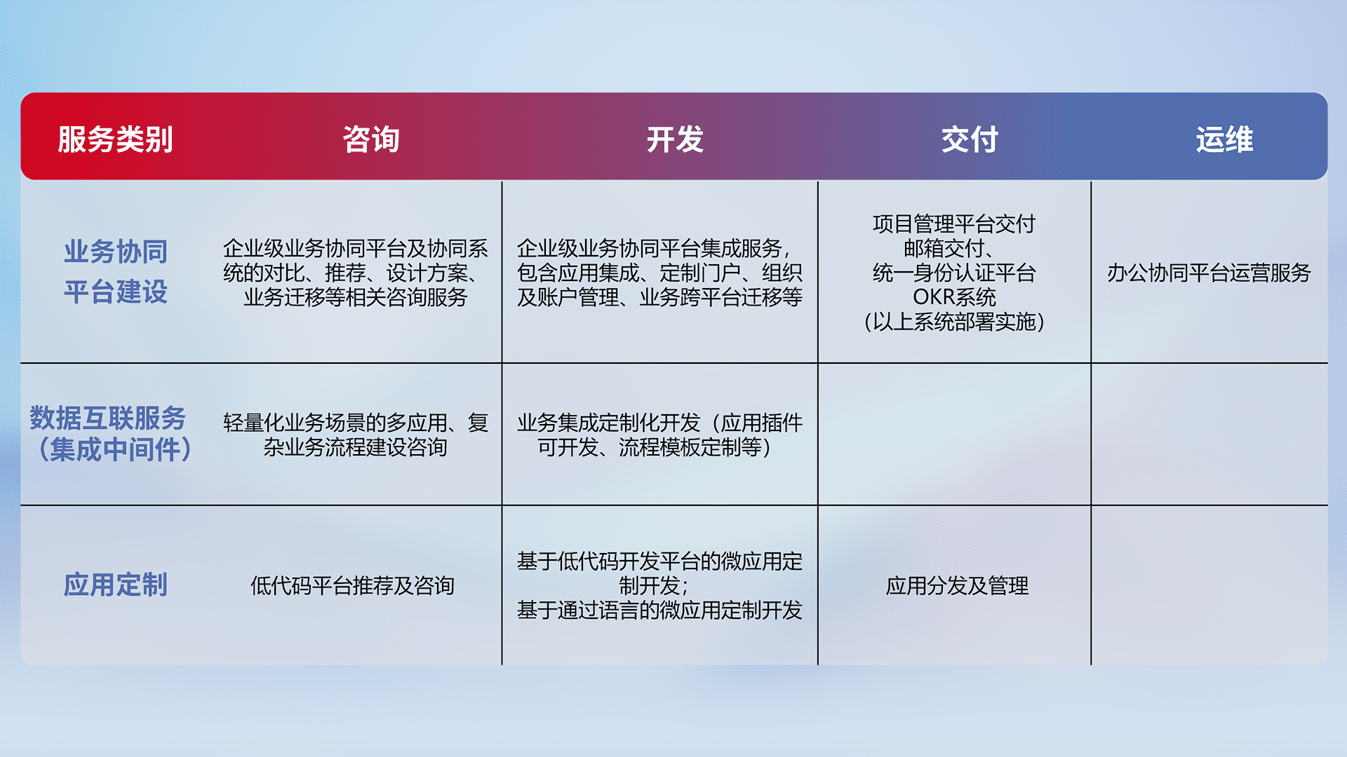 针对钉钉、、、企微、、、、IDaas等平台级产品提供产品的规划、、、方案、、、交付、、、、定制化开发等服务,,,实现如统一协同办公、、、智能客户服务、、混合会议管理、、智能数据查询、、、等业务场景,,实现数字化转型。。。。